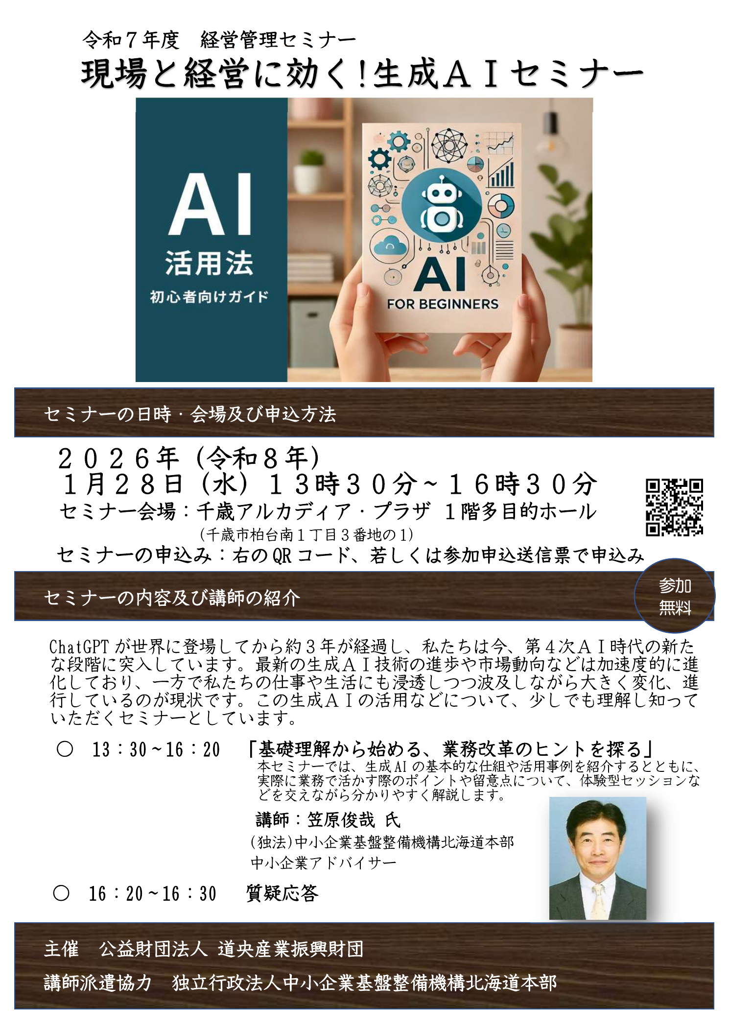 本財団では、本年度の経営管理セミナーとして「現場と経営に効く!生成AIセミナー」と題して、 生成AIの基本的な仕組や活用事例を紹介しながら少しでも理解し、知っていただくセミナーとしています。